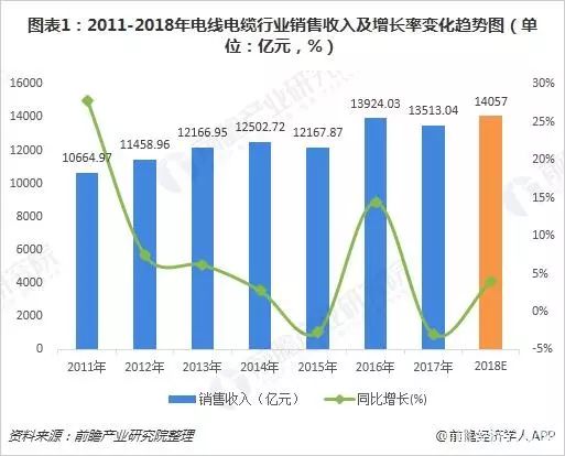 隨著我國電線電纜行業(yè)的調(diào)整進入深化發(fā)展期,其過剩、劣質(zhì)產(chǎn)能的淘汰雖然會對行業(yè)的整體市場規(guī)模有一定的影響,但是產(chǎn)品逐漸由電力電纜向特種電纜轉(zhuǎn)變,在國內(nèi)相關(guān)產(chǎn)業(yè)發(fā)展及對外一帶一路發(fā)展戰(zhàn)略的促進下,2018年我國電線電纜行業(yè)的銷售收入實現(xiàn)繼續(xù)小幅增加,超過14000億元。